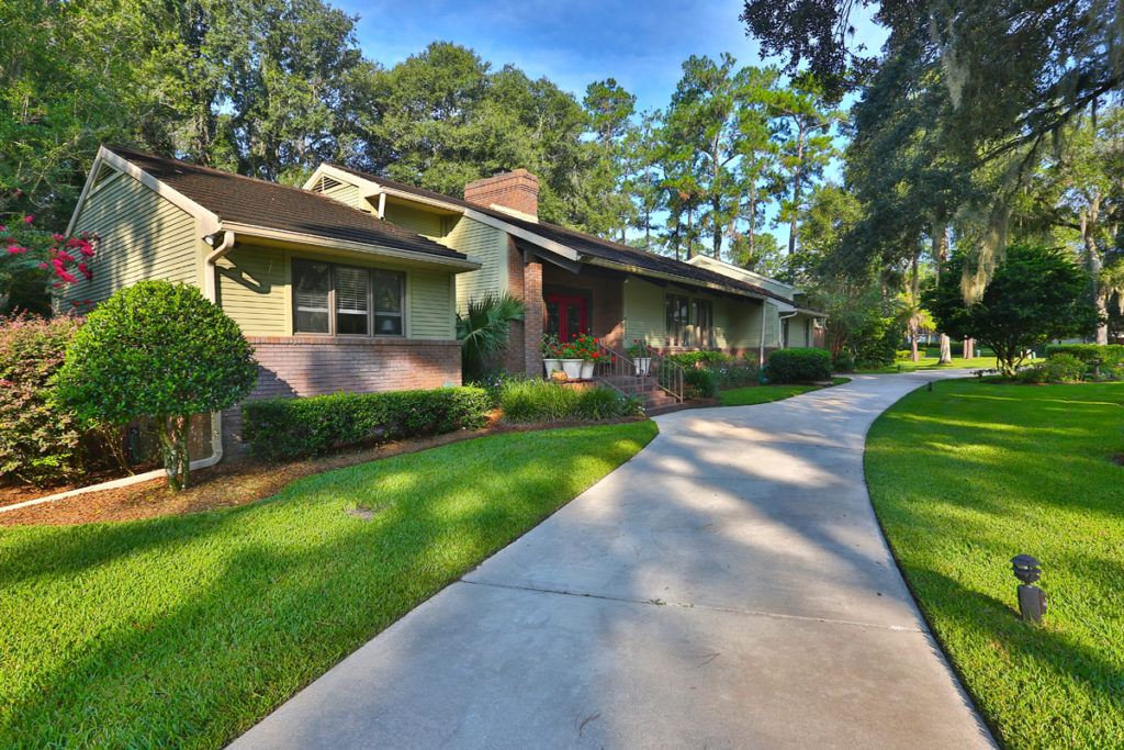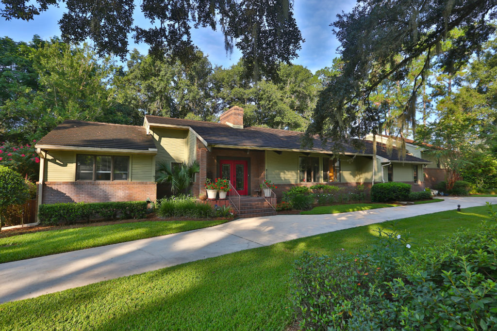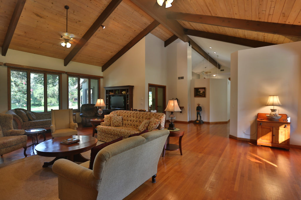 Tons of curb appeal with circular drive and lovely mature landscaping. Entering the new front door, you will be delighted by the natural light flooding the home. Spacious living room with brick fire place and wood beamed ceilings. Formal dining room with butler’s pantry. Split bedroom floor plan. Guest wing offers two bedrooms, spacious bath plus office/den with built in wall units.