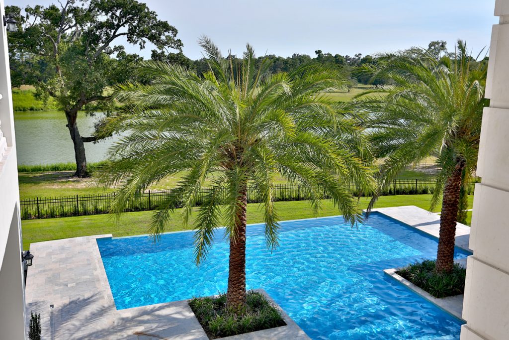 Luxurious pool with waterfall and spa area overlooks the lake and golf course.