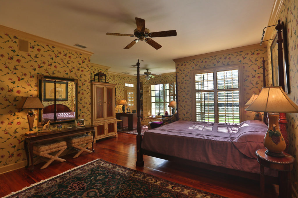 Additionally the sunlit family room with fireplace opens to a covered, screen-enclosed patio and is also open to the 2nd floor. The second floor includes the 3 guest rooms. Most of all the property has rolling hills and magnificent views. Private gated entrance and drive winds through the beautiful Granddaddy Oaks and leads you home.