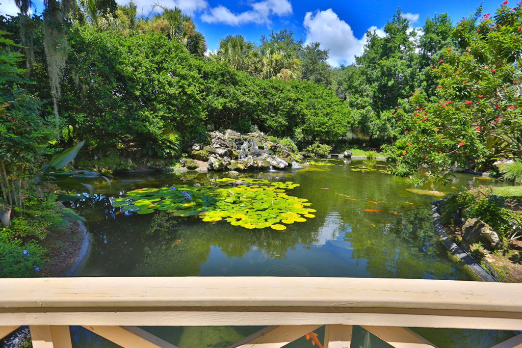 Main residence features: Chef’s kitchen with center island; custom cabinets; formal dining room with double doors overlooking Koi pond. Waterfalls with wooden bridge lead to the exquisite pool and courtyard.