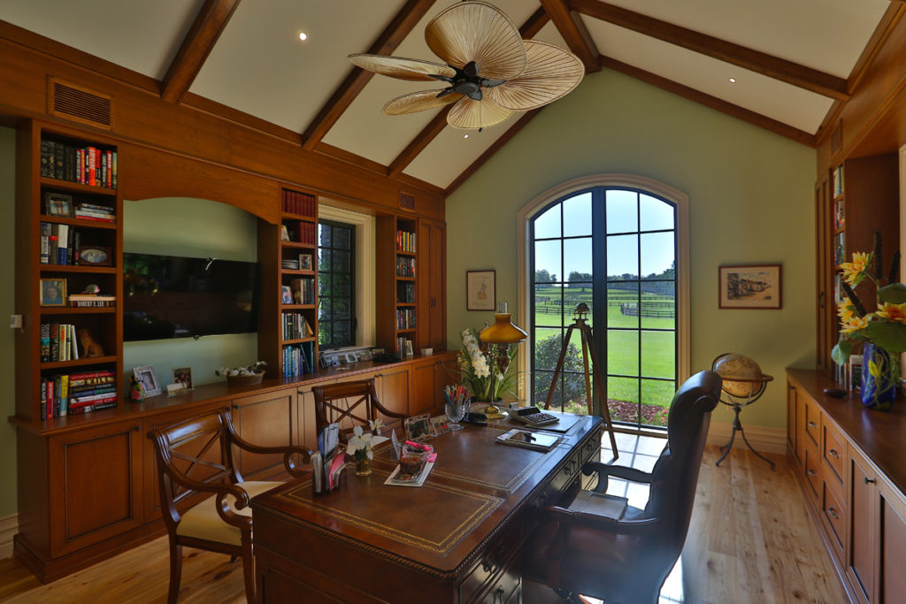 The chef’s kitchen with large island is designed for entertaining, as is the gorgeous open lanai, complete with summer kitchen which overlooks the paddocks and pond.
