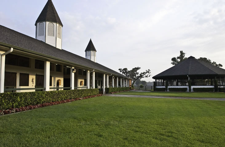 Training complex consists of 116 stalls, 3/4 mile dirt track, 1 Mile turf track, 4 covered hot walkers, round pens, and lush paddocks.
