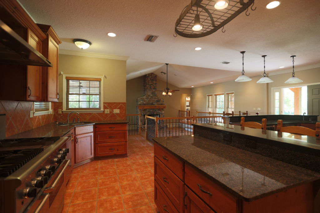 Spacious family room features stone fireplace, french doors leading to pool and is open to the kitchen. Gourmet chef’s kitchen with granite counter tops, 6 burner gas stove, double oven, center island and pantry. Beverage bar has a seating area and built in beverage cooler.