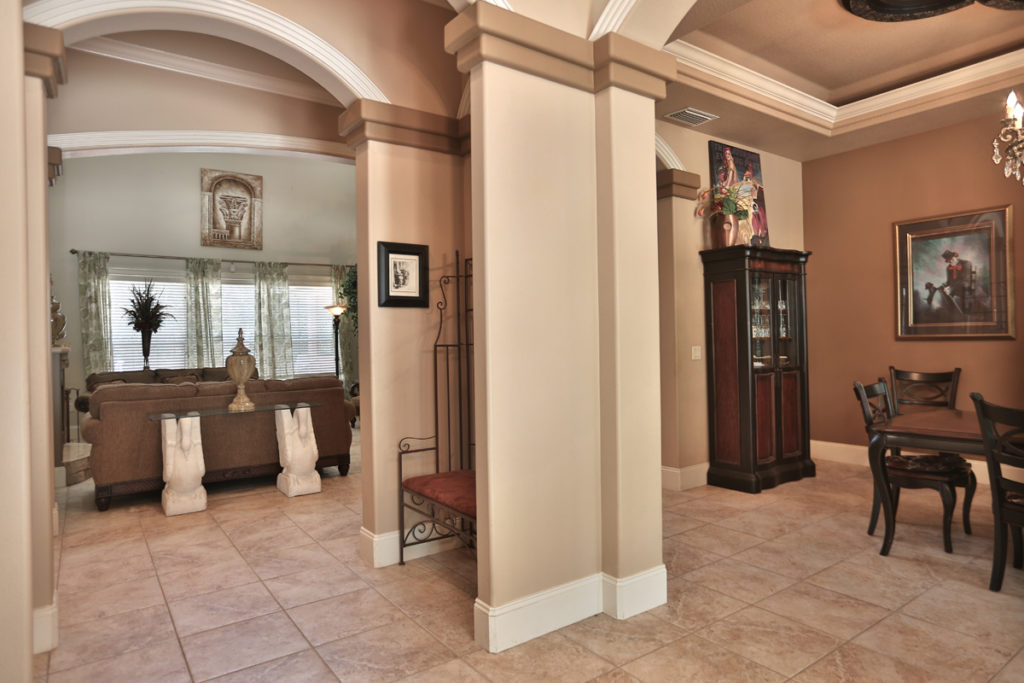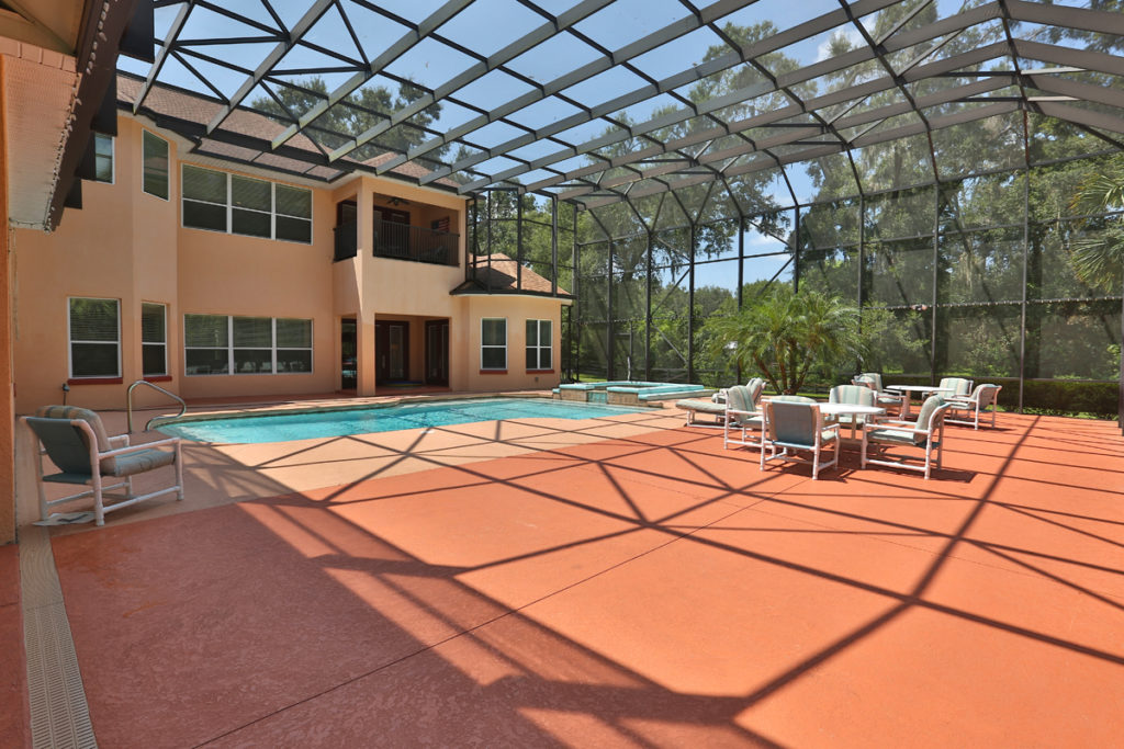 Luxurious living features of the home include: formal living room, formal dining room, office/den plus fireplace with patio doors leading to screen enclosed lanai. Chef’s kitchen with wet bar, center island, recessed ceilings, granite countertop, and raised counter seating area. Kitchen is open to breakfast nook and great room with high ceilings, fireplace, built in bookcases, and French doors leading to lanai. Master suite is located on first floor with en-suite bath.